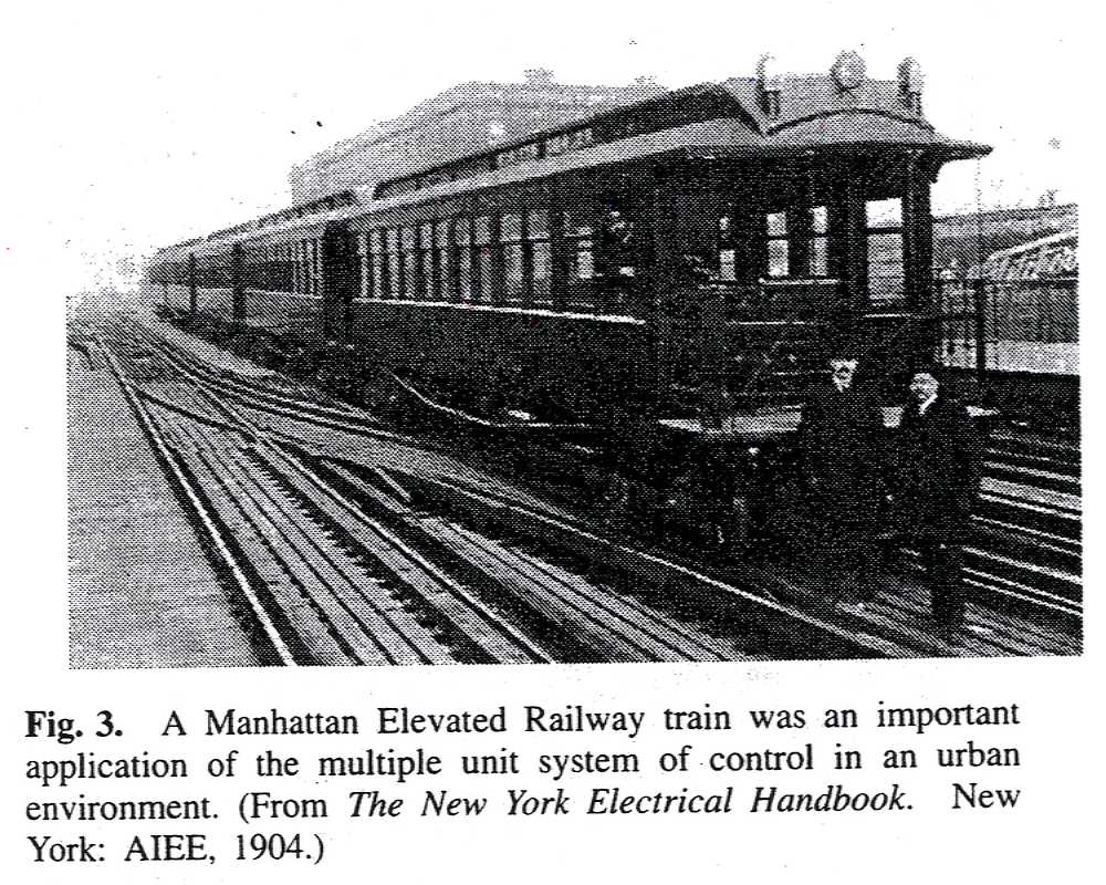Fig. 3. A Manhattan Elevated Railway train was an important application of the multiple unit system of control in an urban environment. (From The New York Electrical Handbook. New York: AIEE, 1904.)