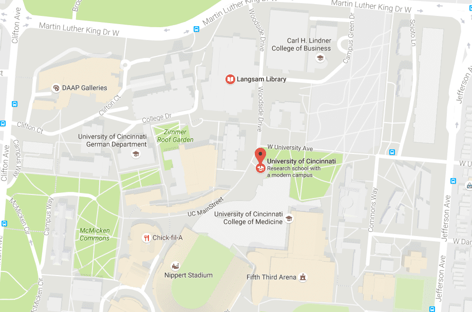 LOCATION: University of Cincinnati Swift Hall, Room 800. 2855 Campus Way, Cincinnati, OH 45221 Directions: The nearest parking garage is Woodside Garage or the Campus Green Garage. There is also on street parking on Martin Luther King Blvd and Clifton Ave.